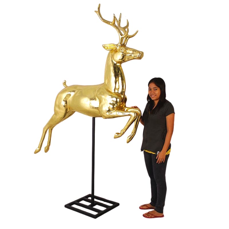 Ce renne doré sur support, proposé à la location, est un élément décoratif visuellement marquant qui trouve facilement sa place dans une scénographie professionnelle. Sa finition métallisée dorée capte la lumière et attire naturellement l’attention, tandis que son mouvement figé en plein saut apporte du dynamisme à l’espace.